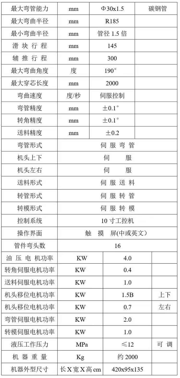 10、电气系统:工控机控制,配有10寸屏,可依工件需要修改参数。系统配置全部采用日本三菱,稳定可靠(详情参见系统配置)。有紧停、脚踏开关、及弯管臂触碰安全开关,确保工作安全性。